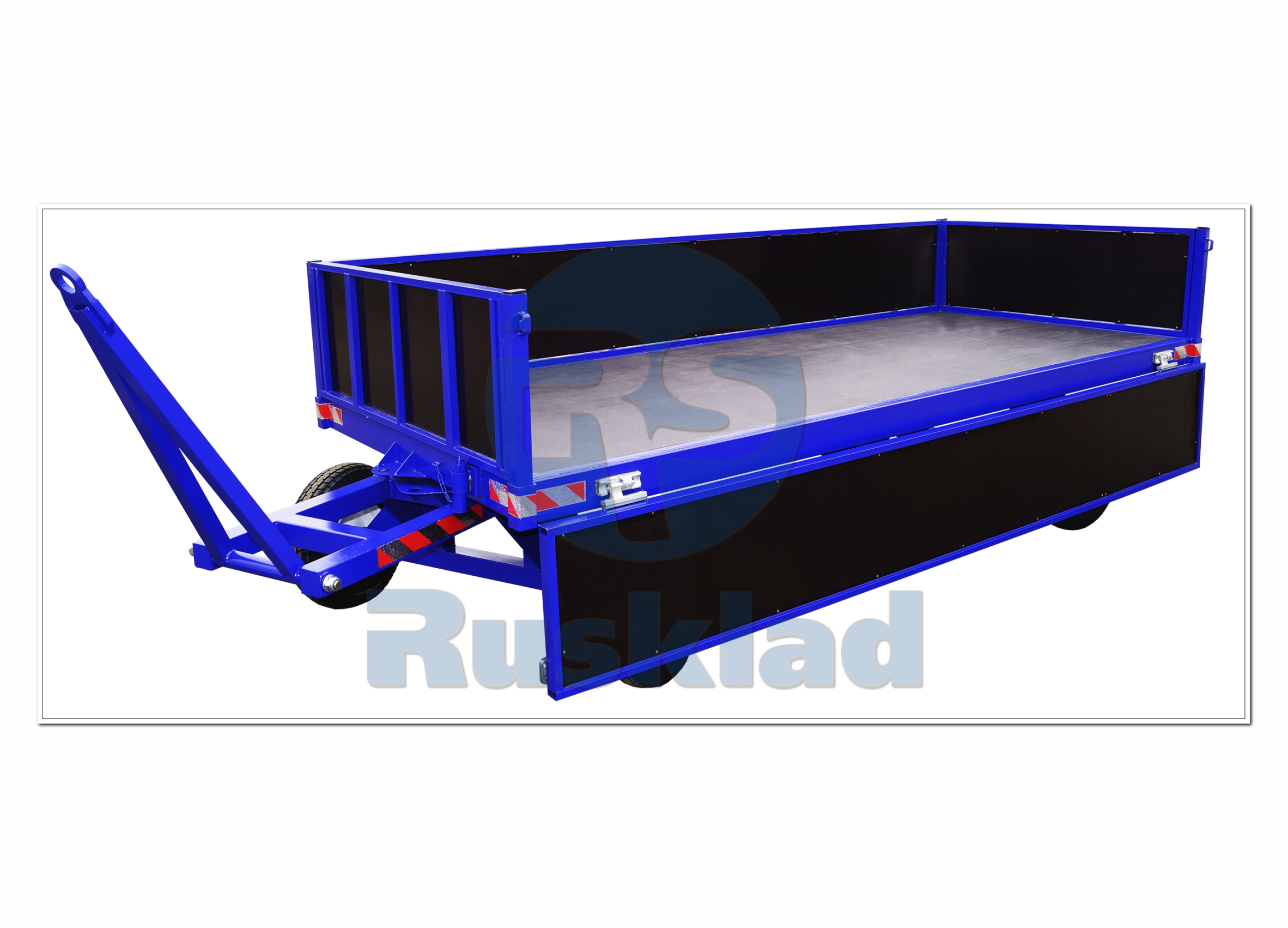 Боковые борта открываются с двух сторон. Борта высотой 420 мм. снабжены фиксаторами.Передняя ось на опорном подшипнике с повышенными характеристиками. Поворотное дышло имеет угол поворота 180 градусов. В задней части расположено прицепное пружинное устройство.